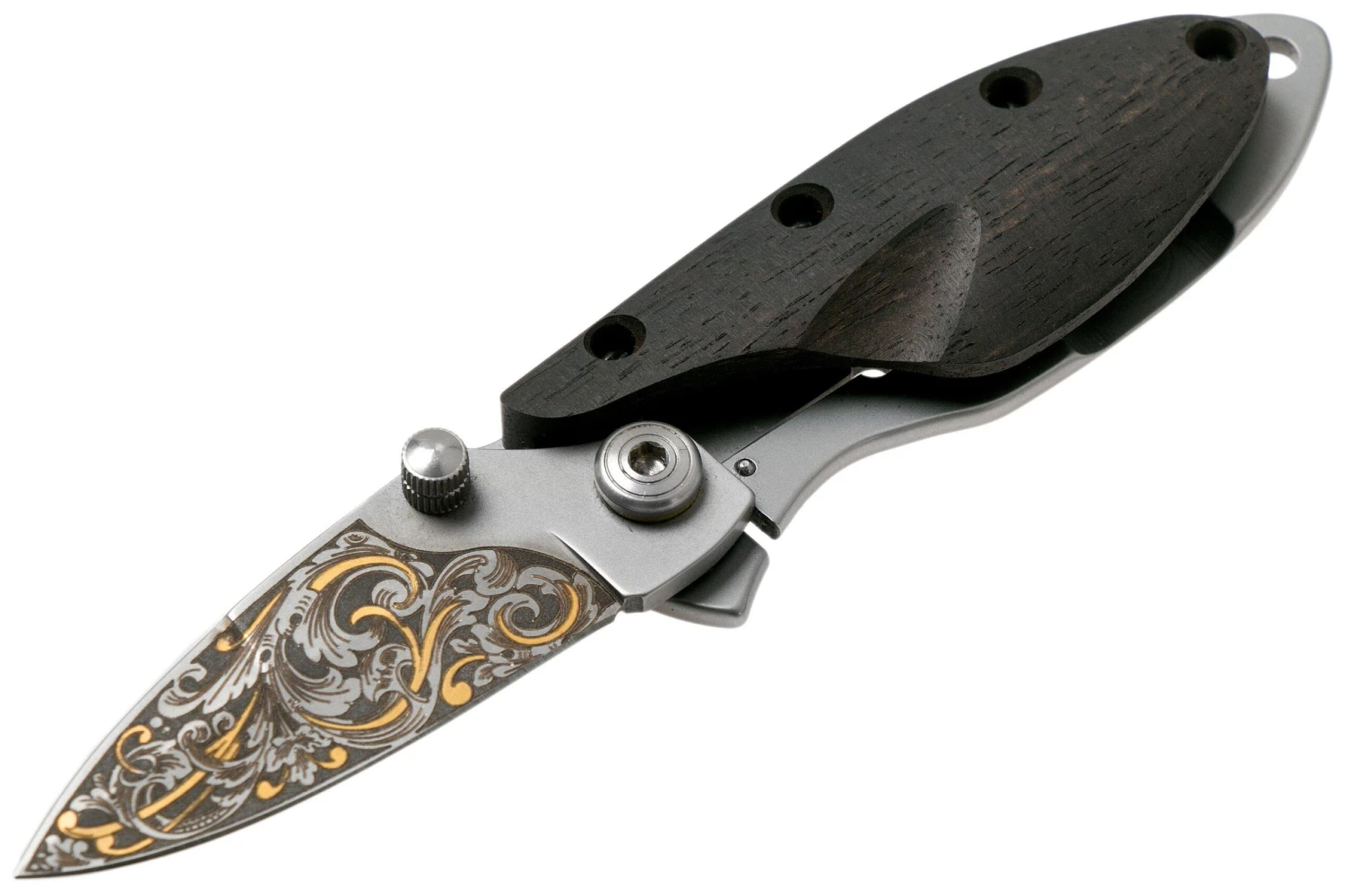 Le Maserin Onefold est un petit couteau de poche spécial, avec un manche très intéressant. Il arbore une face en ébène très fine et une en acier pour le verrouillage. Une conception originale, et pourtant très légère. Ce qui surprend chez ce couteau, c’est qu’il est orné d’or 24 carats !